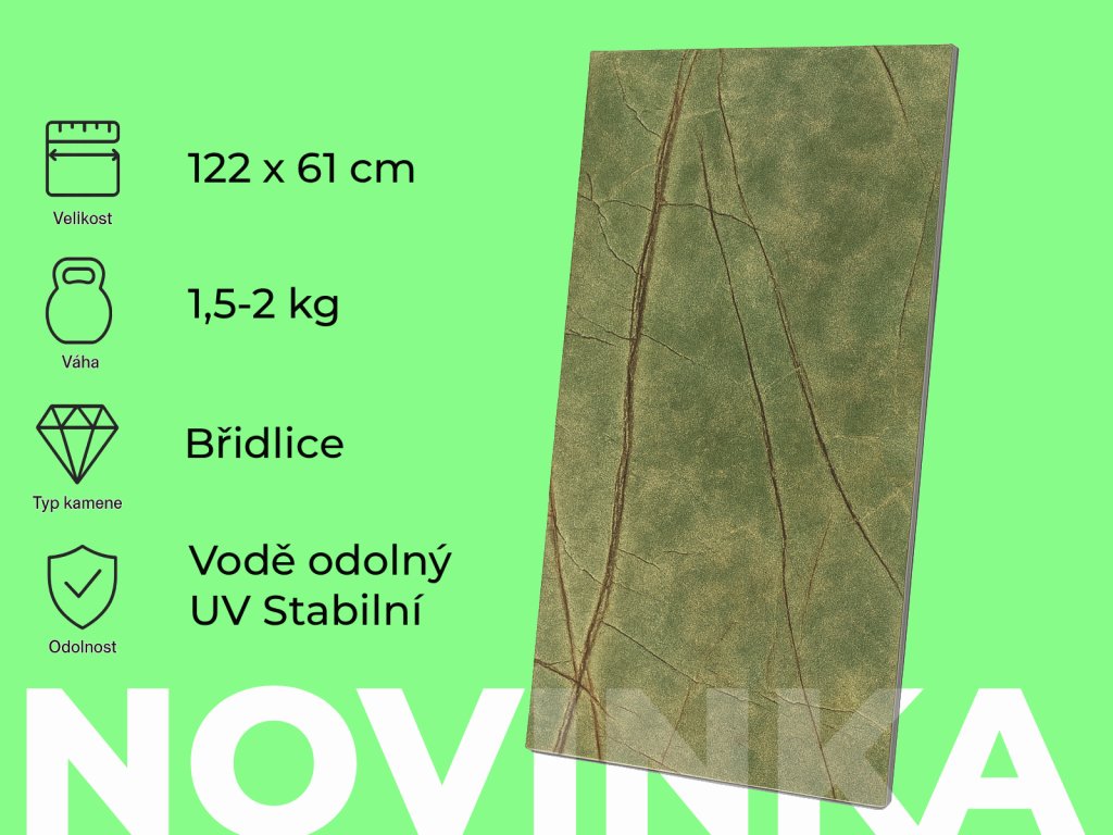 Kamenná dýha v dekoru Rainforest Green přináší do interiéru i exteriéru jedinečný vzhled inspirovaný tropickou přírodou. Zelené a hnědé odstíny se zlatavým žilkováním vytvářejí neopakovatelný efekt, který dodá každému prostoru luxusní charakter.